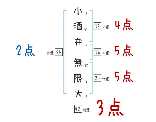 総運![]() | 小酒井無限大さんの総運は42画の3つ星!病気に注意。多芸であるが消極的でおとなしい。 あなたの人生を表す1番重要な運勢です。生涯を通じて影響する総合運となり、主に50歳以降の晩年期に影響を及ぼします。 |