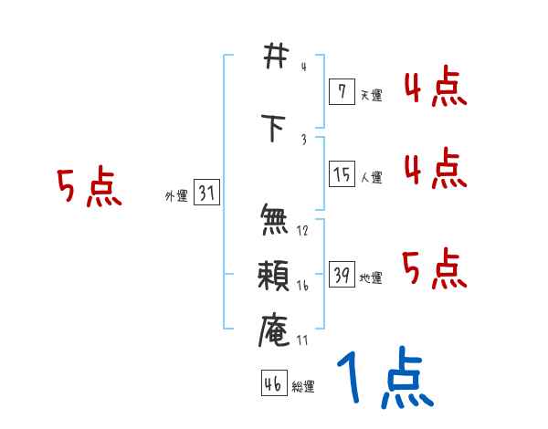 総運![]() | 井下無頼庵さんの総運は46画の1つ星!迷走することが多く苦労するかも。目先のことにとらわれないように。 あなたの人生を表す1番重要な運勢です。生涯を通じて影響する総合運となり、主に50歳以降の晩年期に影響を及ぼします。 |