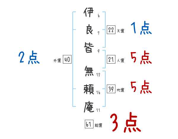地運![]() | 伊良皆無頼庵さんの地運は39画の5つ星!社交性に優れ人望が厚い。人の上に立ち成功する。 個性を表す基礎的な運勢です。性格形成や対人関係、行動力など家庭環境に影響されます。主に誕生してから20歳くらいまでの若年期の運勢を表します。 |