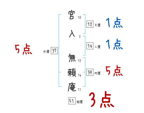 天運![]() | 宮入無頼庵さんの天運は12画の1つ星!簡単な失敗で諦めてしまいやすいかも。着実に行動すると良いでしょう。 家系が持つ宿命的な運勢を表します。祖先から受け継いだ苗字ですので自分の力が及びません。家柄を象徴します。 |
