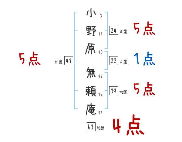 天運![]() | 小野原無頼庵さんの天運は24画の5つ星!家庭運が良く順調な人生。金運にも恵まれる。 家系が持つ宿命的な運勢を表します。祖先から受け継いだ苗字ですので自分の力が及びません。家柄を象徴します。 |