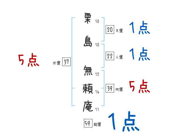 天運![]() | 栗島無頼庵さんの天運は20画の1つ星!社交が苦手。人とは違った才能があり波乱万丈な人生かも。 家系が持つ宿命的な運勢を表します。祖先から受け継いだ苗字ですので自分の力が及びません。家柄を象徴します。 |