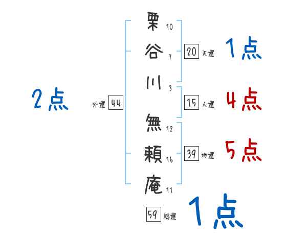 外運![]() | 栗谷川無頼庵さんの外運は44画の2つ星!誠実で慎重な性格。物事を考えすぎないように注意しましょう。 生活面を象徴する運勢です。外部から受ける影響力を表し、結婚運、家庭運や職場、環境への順応性を表します。 |