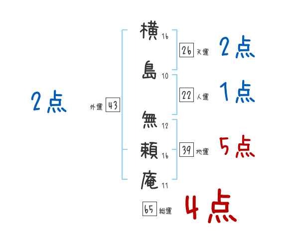 天運![]() | 横島無頼庵さんの天運は26画の2つ星!波瀾万丈かも。信頼できる人を大事にしましょう。 家系が持つ宿命的な運勢を表します。祖先から受け継いだ苗字ですので自分の力が及びません。家柄を象徴します。 |