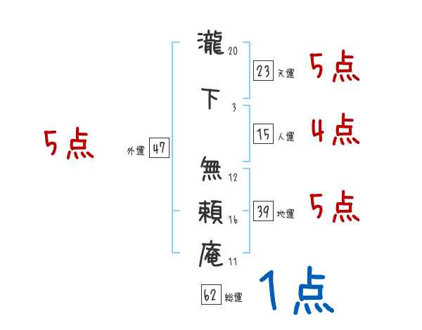 天運![]() | 瀧下無頼庵さんの天運は23画の5つ星!想像力に優れ活力がある。一代で成功し名誉を手に入れる。 家系が持つ宿命的な運勢を表します。祖先から受け継いだ苗字ですので自分の力が及びません。家柄を象徴します。 |