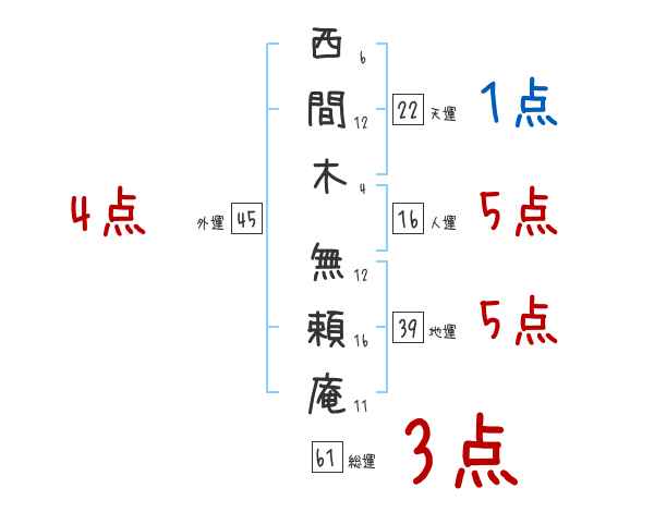 人運![]() | 西間木無頼庵さんの人運は16画の5つ星!人望が厚く大きく発展する。逆転成功が見える。 性格や才能などを表す2番目に重要な運勢です。人間関係や協調性、社会的な成功に影響します。主に20歳から50歳ぐらいまでの中年期の運勢を表します。 |
