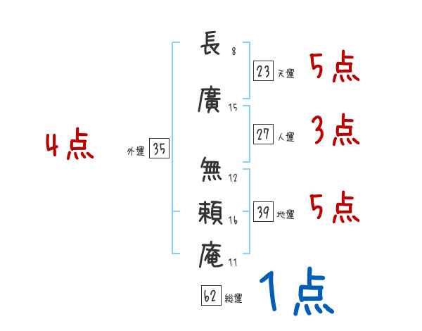 外運![]() | 長廣無頼庵さんの外運は35画の4つ星!温厚な性格で感受性が高い。穏和な性格で人望が厚い。 生活面を象徴する運勢です。外部から受ける影響力を表し、結婚運、家庭運や職場、環境への順応性を表します。 |