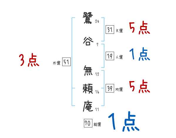 外運![]() | 鷺谷無頼庵さんの外運は51画の3つ星!変化が激しく、危険に注意。堅実な性格。 生活面を象徴する運勢です。外部から受ける影響力を表し、結婚運、家庭運や職場、環境への順応性を表します。 |