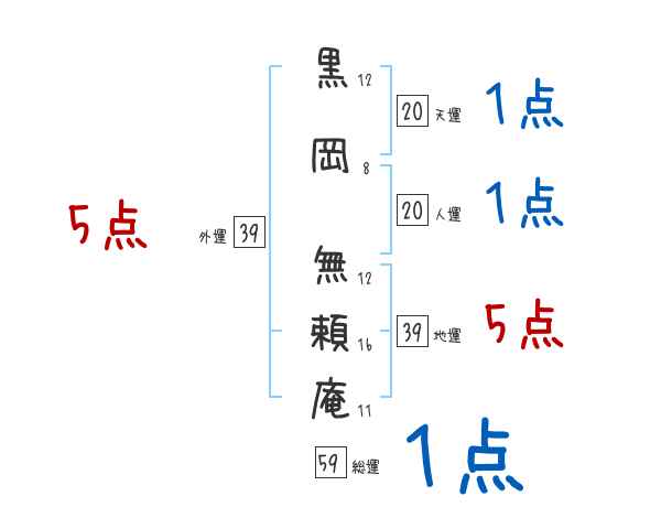 外運![]() | 黒岡無頼庵さんの外運は39画の5つ星!社交性に優れ人望が厚い。人の上に立ち成功する。 生活面を象徴する運勢です。外部から受ける影響力を表し、結婚運、家庭運や職場、環境への順応性を表します。 |