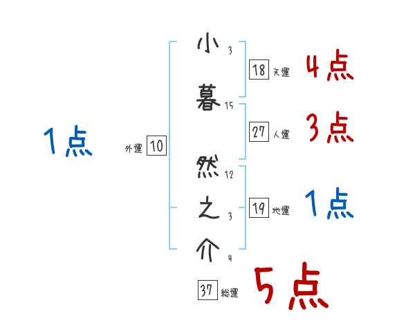 天運![]() | 小暮然之介さんの天運は18画の4つ星!情熱的で剛気。忍耐力があり信頼される。 家系が持つ宿命的な運勢を表します。祖先から受け継いだ苗字ですので自分の力が及びません。家柄を象徴します。 |