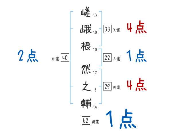 天運![]() | 嵯峨根然之輔さんの天運は33画の4つ星!権力志向でプライドが高い。勇気があり運を切り開き成功する。 家系が持つ宿命的な運勢を表します。祖先から受け継いだ苗字ですので自分の力が及びません。家柄を象徴します。 |