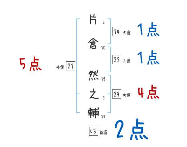 外運![]() | 片倉然之輔さんの外運は21画の5つ星!統率力がある。独立し成功する。名誉を手に入れる。 生活面を象徴する運勢です。外部から受ける影響力を表し、結婚運、家庭運や職場、環境への順応性を表します。 |