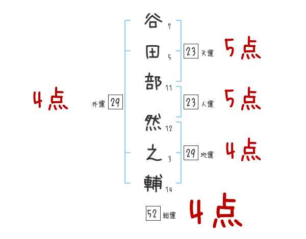 天運![]() | 谷田部然之輔さんの天運は23画の5つ星!想像力に優れ活力がある。一代で成功し名誉を手に入れる。 家系が持つ宿命的な運勢を表します。祖先から受け継いだ苗字ですので自分の力が及びません。家柄を象徴します。 |