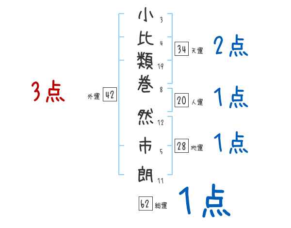 外運![]() | 小比類巻然市朗さんの外運は42画の3つ星!病気に注意。多芸であるが消極的でおとなしい。 生活面を象徴する運勢です。外部から受ける影響力を表し、結婚運、家庭運や職場、環境への順応性を表します。 |