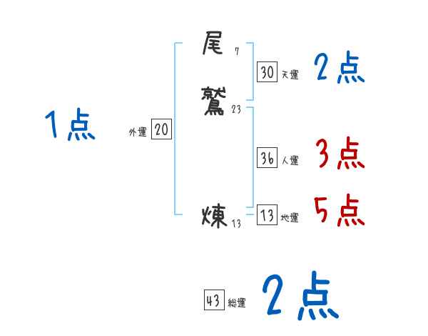 天運![]() | 尾鷲煉さんの天運は30画の2つ星!浮き沈みの激しさに注意しましょう。 家系が持つ宿命的な運勢を表します。祖先から受け継いだ苗字ですので自分の力が及びません。家柄を象徴します。 |
