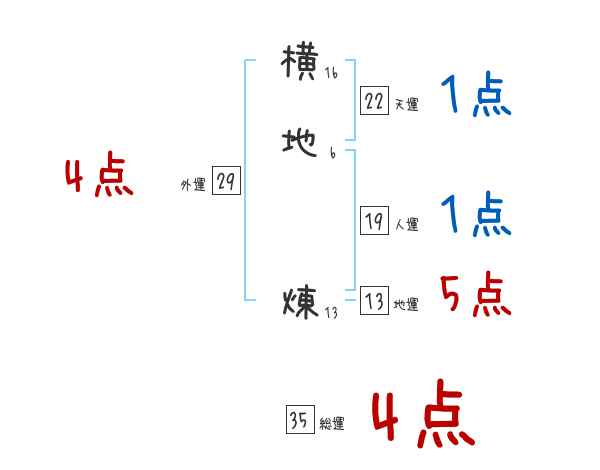 外運![]() | 横地煉さんの外運は29画の4つ星!完全主義で才能がある。厳格な心の持ち主。 生活面を象徴する運勢です。外部から受ける影響力を表し、結婚運、家庭運や職場、環境への順応性を表します。 |