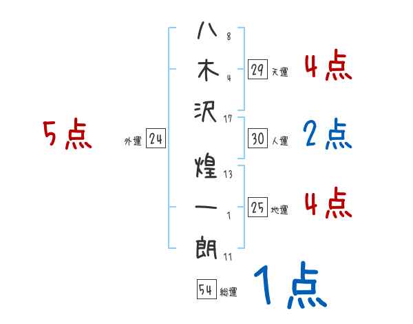 総運![]() | 八木沢煌一朗さんの総運は54画の1つ星!トラブルが多いかも。周りをよく見て協調して過ごしましょう。 あなたの人生を表す1番重要な運勢です。生涯を通じて影響する総合運となり、主に50歳以降の晩年期に影響を及ぼします。 |