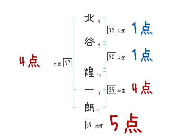外運![]() | 北谷煌一朗さんの外運は17画の4つ星!積極的な行動力。地位を気づき財産を手に入れる。純粋な心と直感力。 生活面を象徴する運勢です。外部から受ける影響力を表し、結婚運、家庭運や職場、環境への順応性を表します。 |