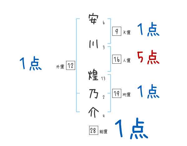 総運![]() | 安川煌乃介さんの総運は28画の1つ星!家庭環境に注意。スポーツで活躍できる能力があるかも。 あなたの人生を表す1番重要な運勢です。生涯を通じて影響する総合運となり、主に50歳以降の晩年期に影響を及ぼします。 |