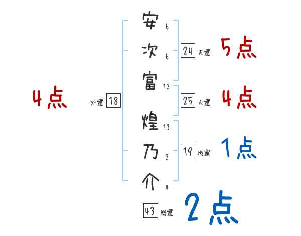 総運![]() | 安次富煌乃介さんの総運は43画の2つ星!頑固な性格で独立心が強いかも。やや非現実的で浪費に注意しましょう。 あなたの人生を表す1番重要な運勢です。生涯を通じて影響する総合運となり、主に50歳以降の晩年期に影響を及ぼします。 |