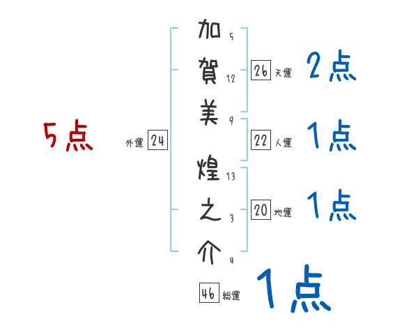 | 天運  | 加賀美煌之介さんの天運は26画の2つ星!波瀾万丈かも。信頼できる人を大事にしましょう。家系が持つ宿命的な運勢を表します。祖先から受け継いだ苗字ですので自分の力が及びません。家柄を象徴します。 |