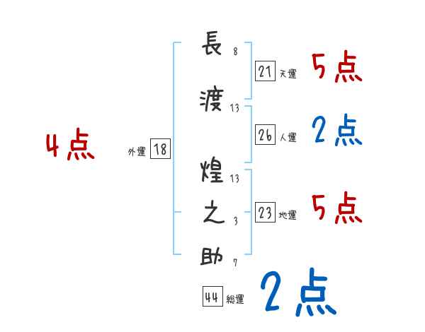総運![]() | 長渡煌之助さんの総運は44画の2つ星!誠実で慎重な性格。物事を考えすぎないように注意しましょう。 あなたの人生を表す1番重要な運勢です。生涯を通じて影響する総合運となり、主に50歳以降の晩年期に影響を及ぼします。 |