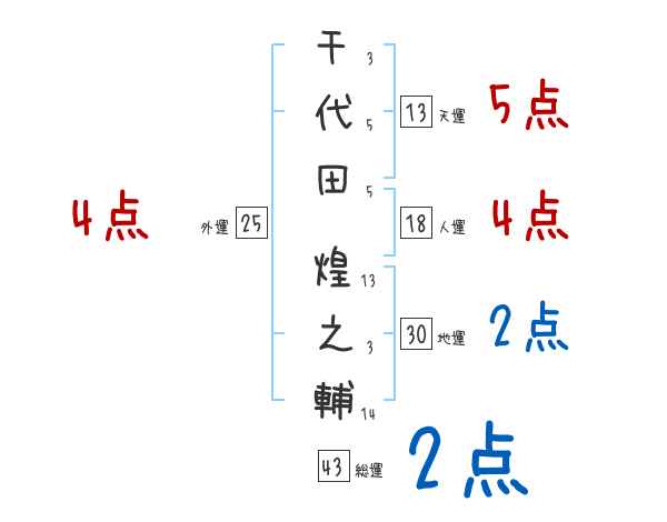 天運![]() | 千代田煌之輔さんの天運は13画の5つ星!才能に恵まれ人気がある。名声を手に入れる。円満な人生。 家系が持つ宿命的な運勢を表します。祖先から受け継いだ苗字ですので自分の力が及びません。家柄を象徴します。 |