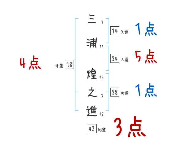 外運![]() | 三浦煌之進さんの外運は18画の4つ星!情熱的で剛気。忍耐力があり信頼される。 生活面を象徴する運勢です。外部から受ける影響力を表し、結婚運、家庭運や職場、環境への順応性を表します。 |