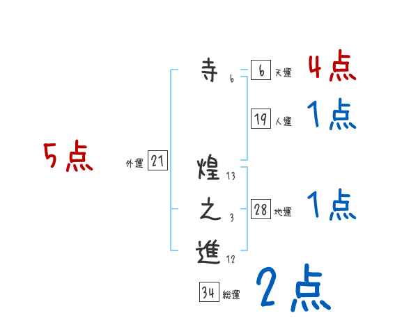 総運![]() | 寺煌之進さんの総運は34画の2つ星!独創性に優れるが、自尊心が強く災難に注意しましょう。 あなたの人生を表す1番重要な運勢です。生涯を通じて影響する総合運となり、主に50歳以降の晩年期に影響を及ぼします。 |