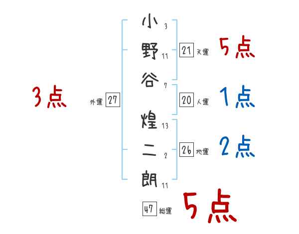 天運![]() | 小野谷煌二朗さんの天運は21画の5つ星!統率力がある。独立し成功する。名誉を手に入れる。 家系が持つ宿命的な運勢を表します。祖先から受け継いだ苗字ですので自分の力が及びません。家柄を象徴します。 |
