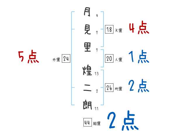 外運![]() | 月見里煌二朗さんの外運は24画の5つ星!家庭運が良く順調な人生。金運にも恵まれる。 生活面を象徴する運勢です。外部から受ける影響力を表し、結婚運、家庭運や職場、環境への順応性を表します。 |