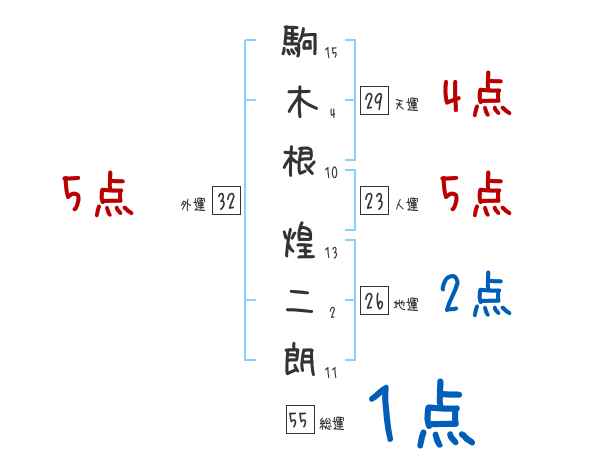 外運![]() | 駒木根煌二朗さんの外運は32画の5つ星!柔軟性があり成功する。チャンスが多く金運が良い。 生活面を象徴する運勢です。外部から受ける影響力を表し、結婚運、家庭運や職場、環境への順応性を表します。 |