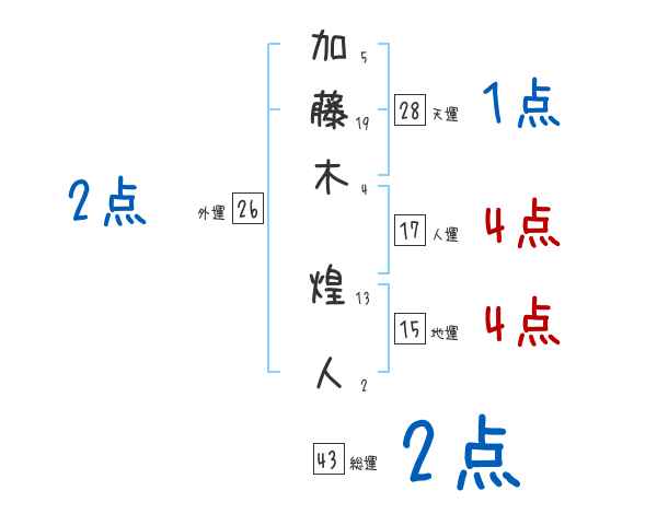 天運![]() | 加藤木煌人さんの天運は28画の1つ星!家庭環境に注意。スポーツで活躍できる能力があるかも。 家系が持つ宿命的な運勢を表します。祖先から受け継いだ苗字ですので自分の力が及びません。家柄を象徴します。 |