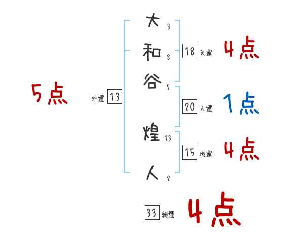 天運![]() | 大和谷煌人さんの天運は18画の4つ星!情熱的で剛気。忍耐力があり信頼される。 家系が持つ宿命的な運勢を表します。祖先から受け継いだ苗字ですので自分の力が及びません。家柄を象徴します。 |