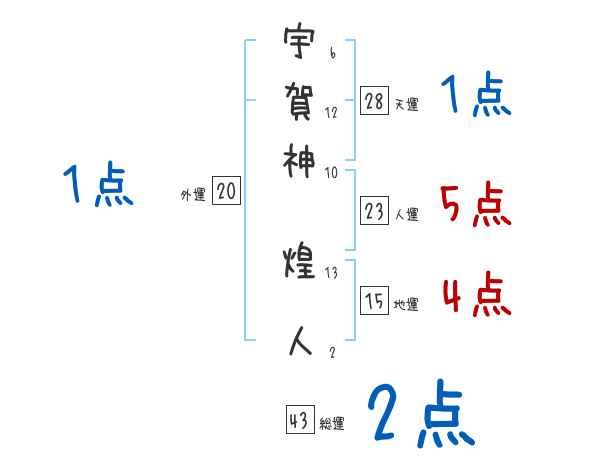 天運![]() | 宇賀神煌人さんの天運は28画の1つ星!家庭環境に注意。スポーツで活躍できる能力があるかも。 家系が持つ宿命的な運勢を表します。祖先から受け継いだ苗字ですので自分の力が及びません。家柄を象徴します。 |