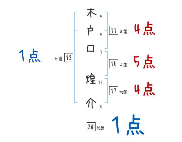 人運![]() | 木戸口煌介さんの人運は16画の5つ星!人望が厚く大きく発展する。逆転成功が見える。 性格や才能などを表す2番目に重要な運勢です。人間関係や協調性、社会的な成功に影響します。主に20歳から50歳ぐらいまでの中年期の運勢を表します。 |