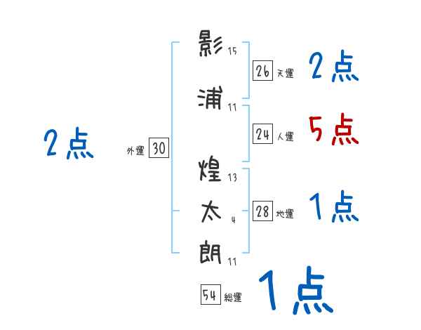 総運![]() | 影浦煌太朗さんの総運は54画の1つ星!トラブルが多いかも。周りをよく見て協調して過ごしましょう。 あなたの人生を表す1番重要な運勢です。生涯を通じて影響する総合運となり、主に50歳以降の晩年期に影響を及ぼします。 |