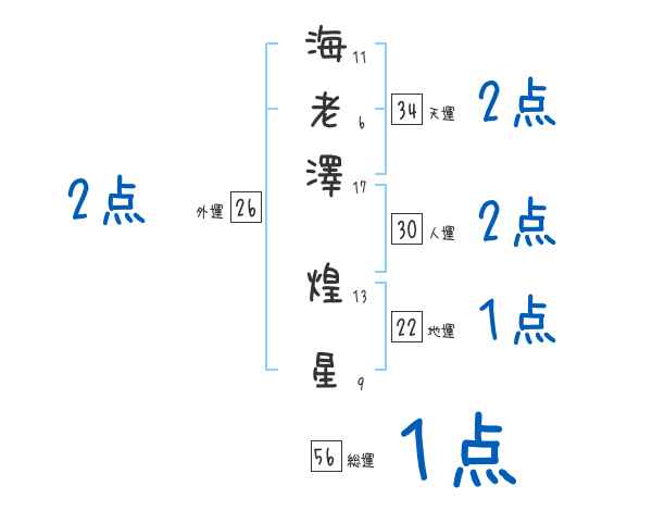 総運![]() | 海老澤煌星さんの総運は56画の1つ星!消極的で無気力になりがち。誠実な気持ちが必要でしょう。 あなたの人生を表す1番重要な運勢です。生涯を通じて影響する総合運となり、主に50歳以降の晩年期に影響を及ぼします。 |