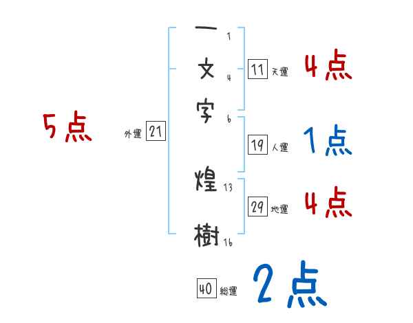 人運![]() | 一文字煌樹さんの人運は19画の1つ星!優れた才能を持ちますが、協調性が足りないことも。周りの人と協力する事を意識しましょう。 性格や才能などを表す2番目に重要な運勢です。人間関係や協調性、社会的な成功に影響します。主に20歳から50歳ぐらいまでの中年期の運勢を表します。 |