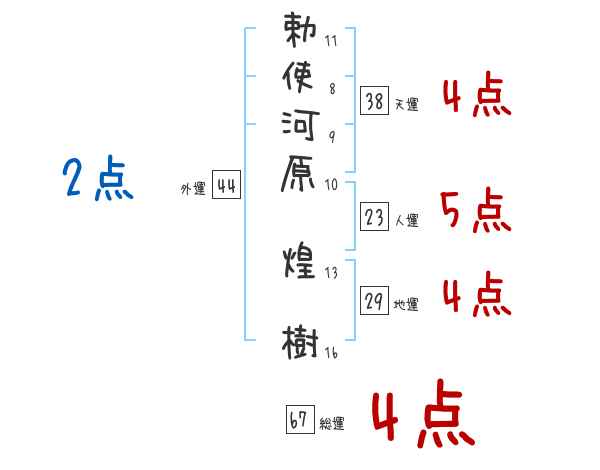 外運![]() | 勅使河原煌樹さんの外運は44画の2つ星!誠実で慎重な性格。物事を考えすぎないように注意しましょう。 生活面を象徴する運勢です。外部から受ける影響力を表し、結婚運、家庭運や職場、環境への順応性を表します。 |
