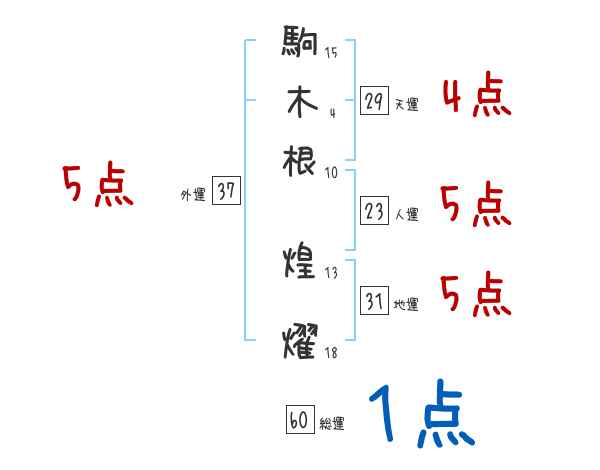 総運![]() | 駒木根煌燿さんの総運は60画の1つ星!悲観的で迷いやすい。波乱が多く損をしないように。 あなたの人生を表す1番重要な運勢です。生涯を通じて影響する総合運となり、主に50歳以降の晩年期に影響を及ぼします。 |