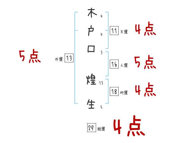 総運![]() | 木戸口煌生さんの総運は29画の4つ星!完全主義で才能がある。厳格な心の持ち主。 あなたの人生を表す1番重要な運勢です。生涯を通じて影響する総合運となり、主に50歳以降の晩年期に影響を及ぼします。 |
