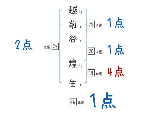 総運![]() | 越前谷煌生さんの総運は46画の1つ星!迷走することが多く苦労するかも。目先のことにとらわれないように。 あなたの人生を表す1番重要な運勢です。生涯を通じて影響する総合運となり、主に50歳以降の晩年期に影響を及ぼします。 |