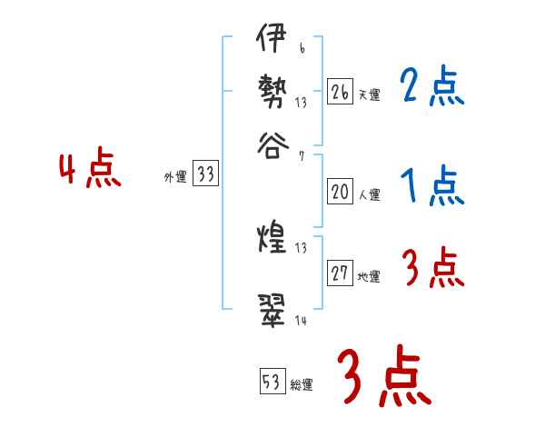 外運![]() | 伊勢谷煌翠さんの外運は33画の4つ星!権力志向でプライドが高い。勇気があり運を切り開き成功する。 生活面を象徴する運勢です。外部から受ける影響力を表し、結婚運、家庭運や職場、環境への順応性を表します。 |