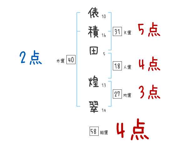 外運![]() | 俵積田煌翠さんの外運は40画の2つ星!自信過剰で物事に固執するためトラブルに注意。 生活面を象徴する運勢です。外部から受ける影響力を表し、結婚運、家庭運や職場、環境への順応性を表します。 |