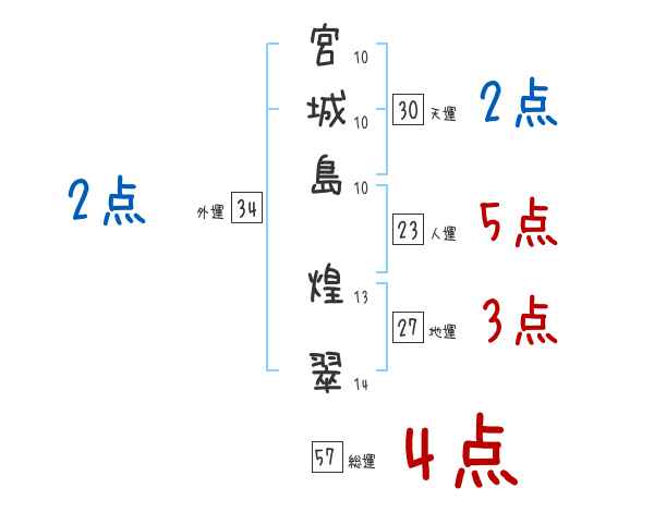 総運![]() | 宮城島煌翠さんの総運は57画の4つ星!向上心があり人望がある。地位を得る。 あなたの人生を表す1番重要な運勢です。生涯を通じて影響する総合運となり、主に50歳以降の晩年期に影響を及ぼします。 |