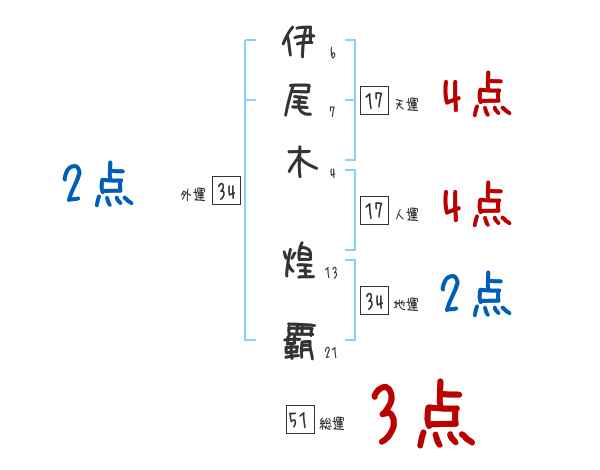 人運![]() | 伊尾木煌覇さんの人運は17画の4つ星!積極的な行動力。地位を気づき財産を手に入れる。純粋な心と直感力。 性格や才能などを表す2番目に重要な運勢です。人間関係や協調性、社会的な成功に影響します。主に20歳から50歳ぐらいまでの中年期の運勢を表します。 |
