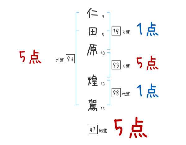 総運![]() | 仁田原煌駕さんの総運は47画の5つ星!実力が開花し発展する円満な人生。財に恵まれる。 あなたの人生を表す1番重要な運勢です。生涯を通じて影響する総合運となり、主に50歳以降の晩年期に影響を及ぼします。 |
