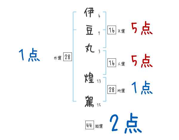 天運![]() | 伊豆丸煌駕さんの天運は16画の5つ星!人望が厚く大きく発展する。逆転成功が見える。 家系が持つ宿命的な運勢を表します。祖先から受け継いだ苗字ですので自分の力が及びません。家柄を象徴します。 |