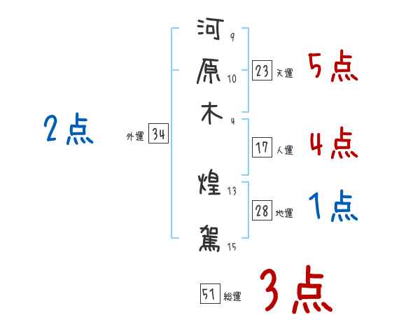 総運![]() | 河原木煌駕さんの総運は51画の3つ星!変化が激しく、危険に注意。堅実な性格。 あなたの人生を表す1番重要な運勢です。生涯を通じて影響する総合運となり、主に50歳以降の晩年期に影響を及ぼします。 |